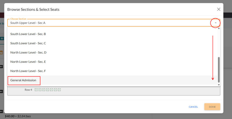- In the drop-down menu scroll to the bottom and select General Admission